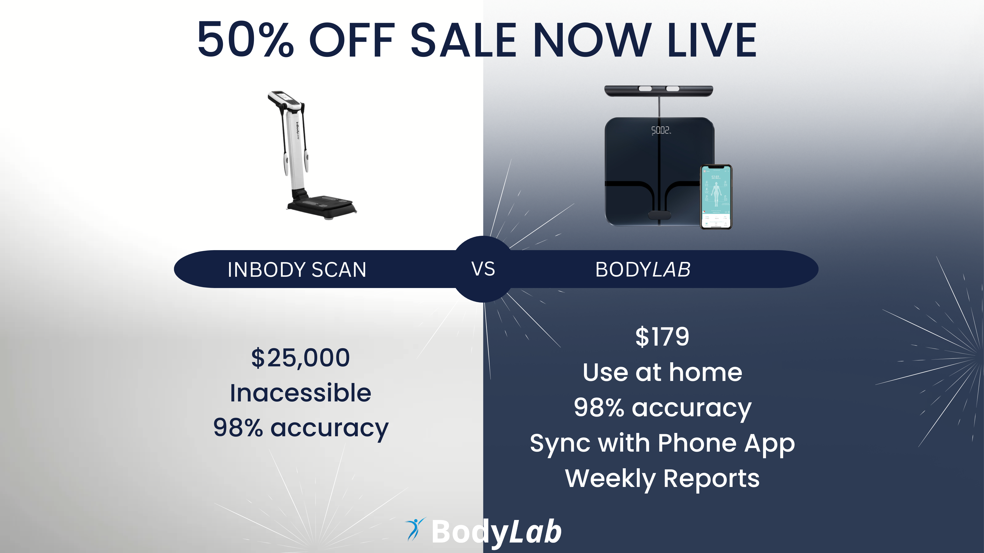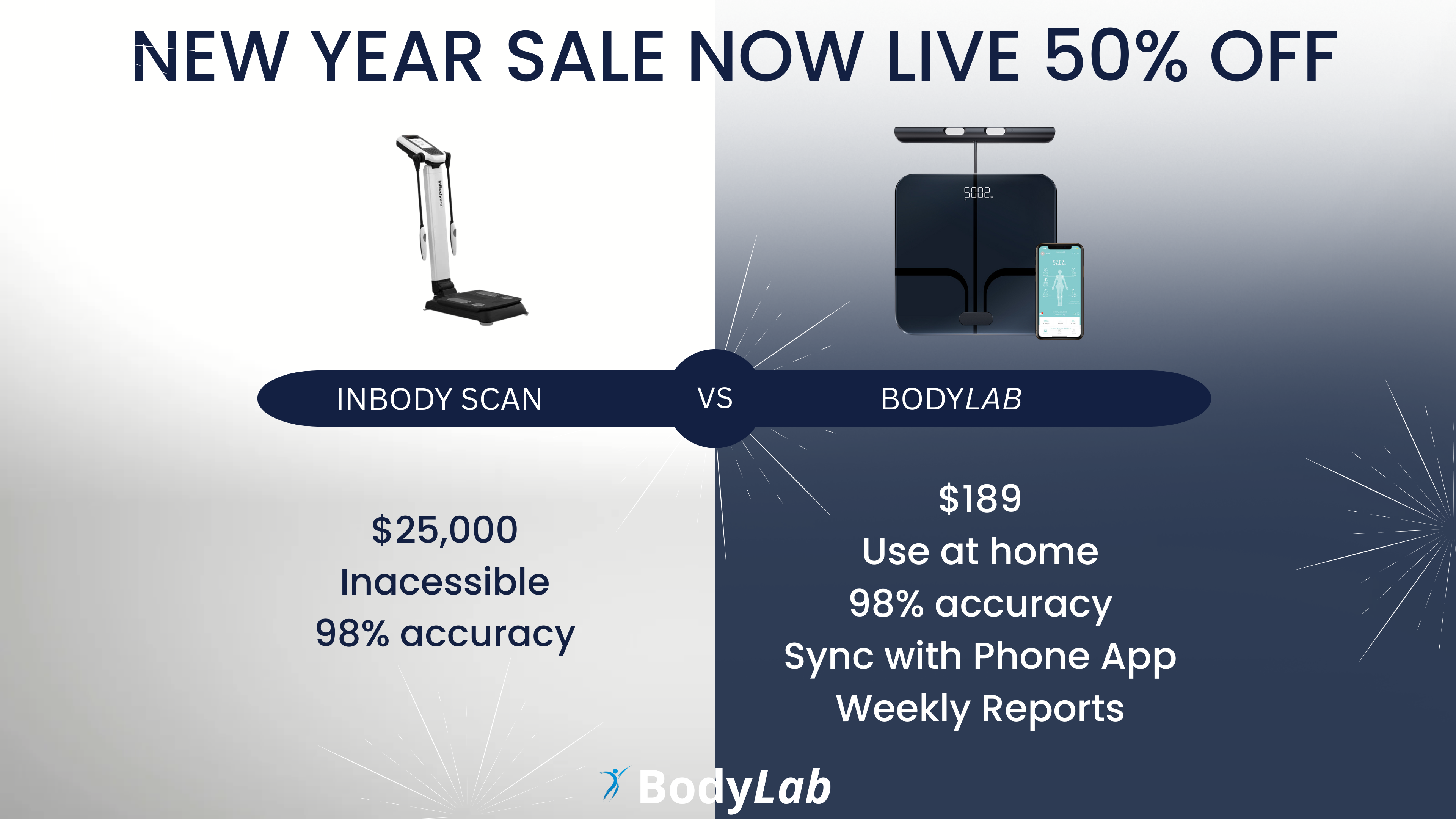 The BodyLab Smart Scale offers full-body insights with exceptional accuracy—measuring muscle mass, body fat, and water composition. Unlike standard smart scales that rely on partial readings and estimations, BodyLab captures data from your entire body, giving you reliable results you can trust to track your progress and reach your fitness goals with confidence.